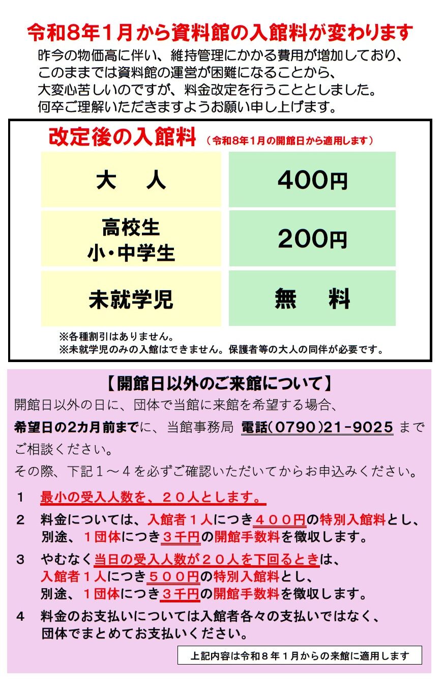 同じく、令和8年1月からの平日の団体・ツアーの受け入れ時の入館料についても改定します。