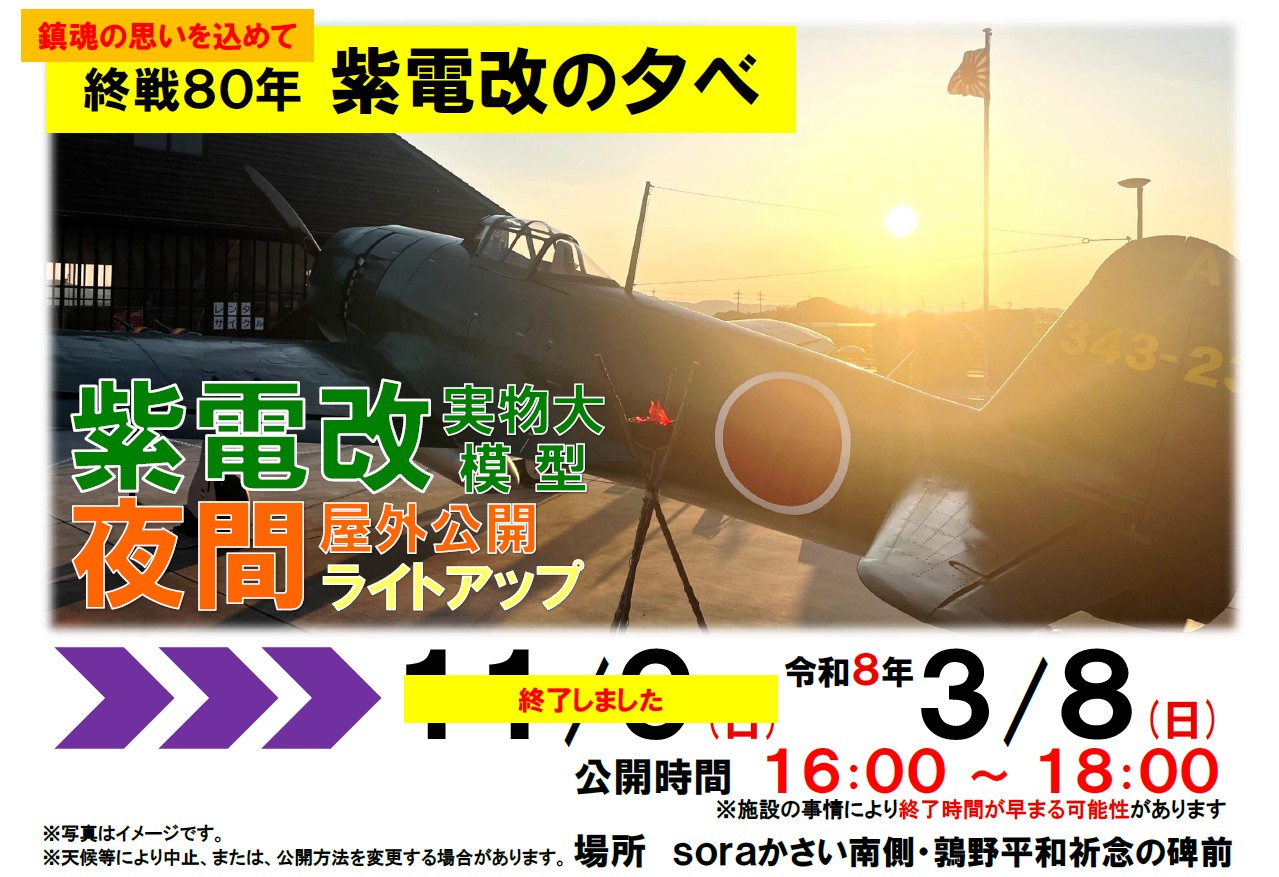 次回の「紫電改」実物大模型の夜間屋外公開・ライトアップ「紫電改の夕べ」は、令和8年3月8日(日)に実施します。