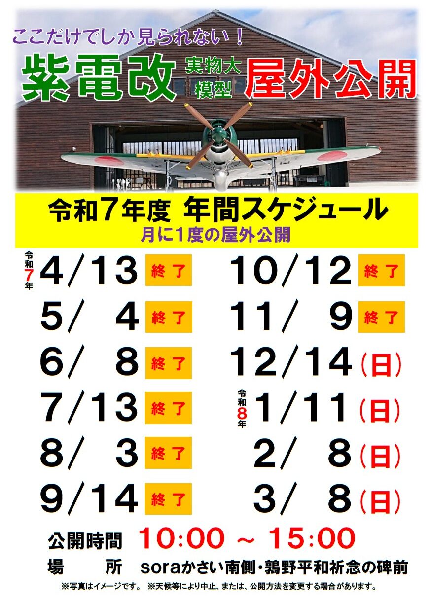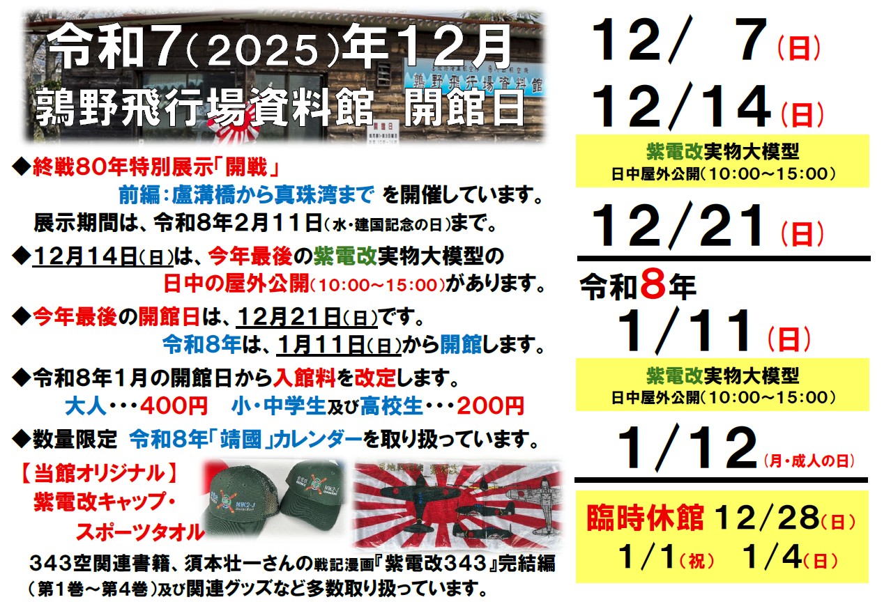 令和7年12月資料館開館日、12/14「紫電改」実物大模型日中屋外公開について