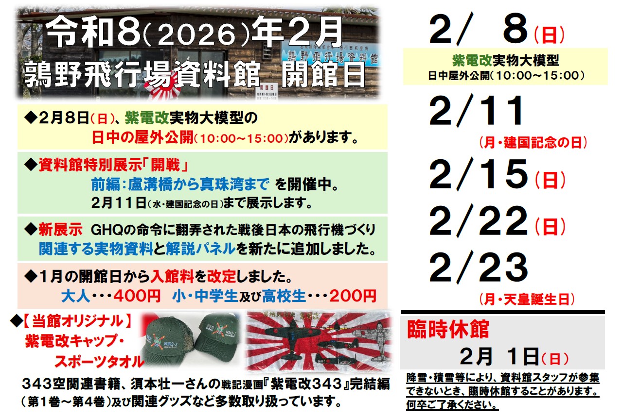 令和8年2月資料館開館日、2/8「紫電改」実物大模型日中屋外公開について