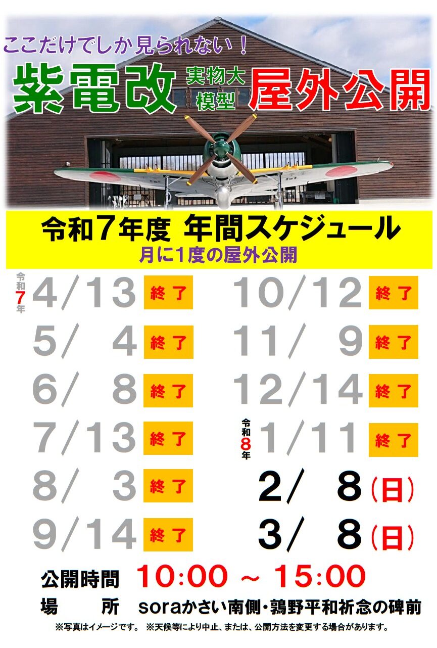 「紫電改」実物大模型の日中屋外公開(10:00~15:00)は、2月8日(日)です。屋外のため、暖かい服装でお越しください。