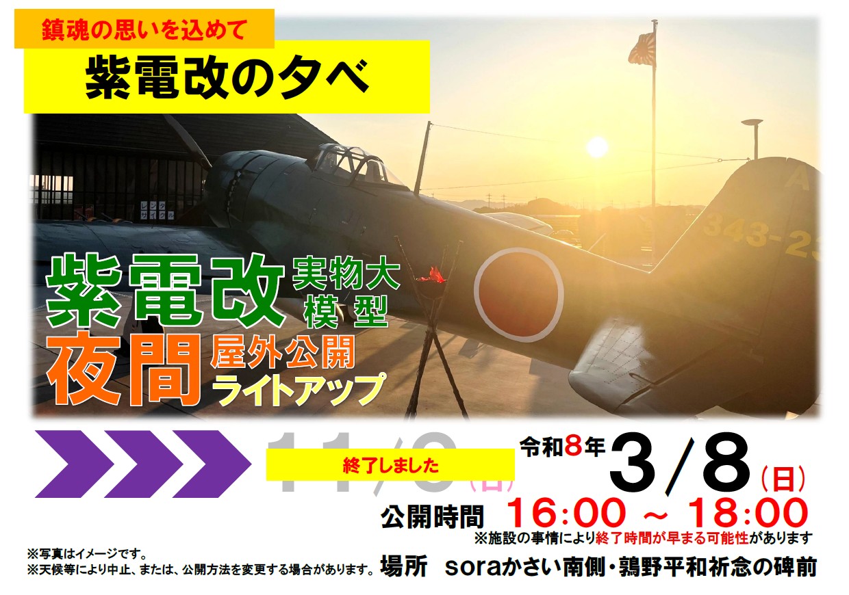 次回の「紫電改」実物大模型の夜間屋外公開・ライトアップ「紫電改の夕べ」は、令和8年3月8日(日)に実施します。